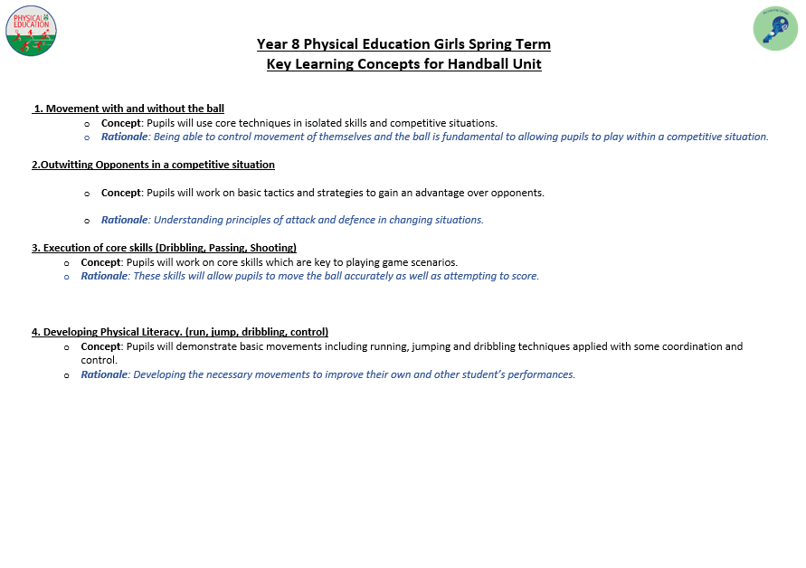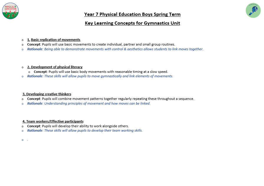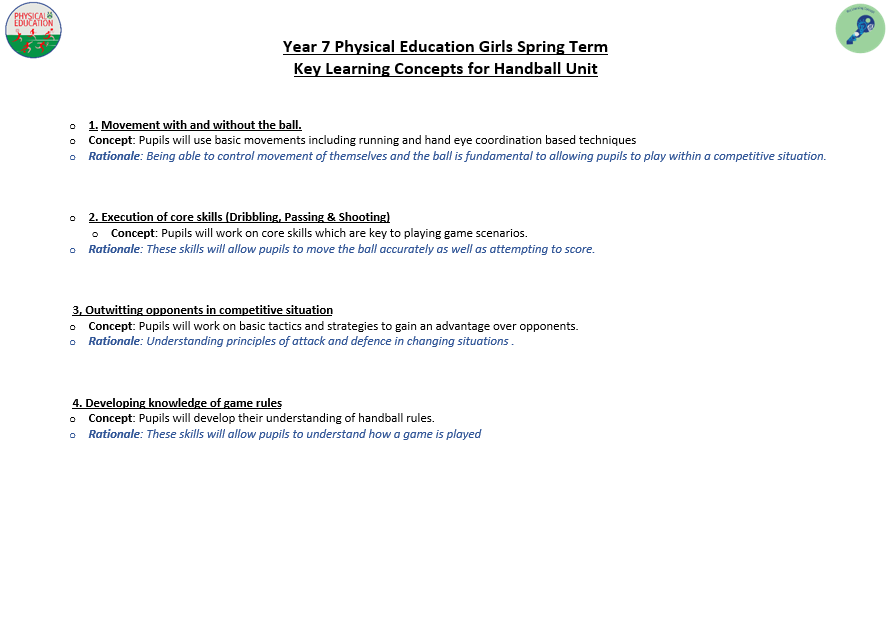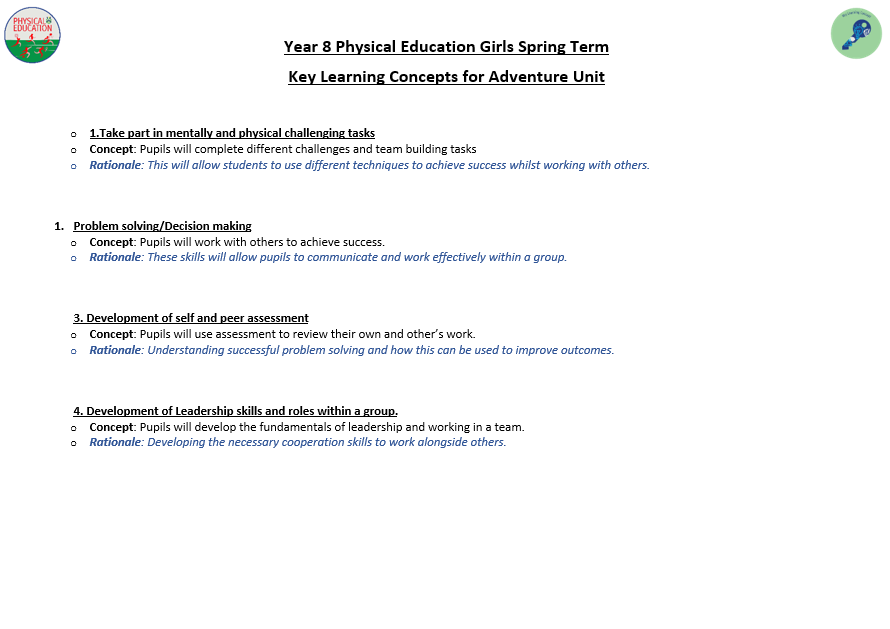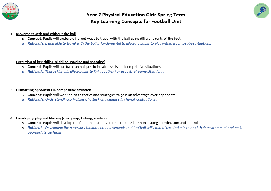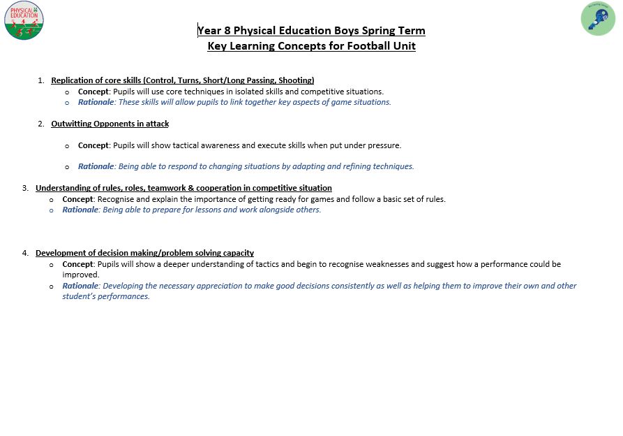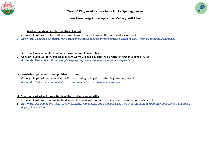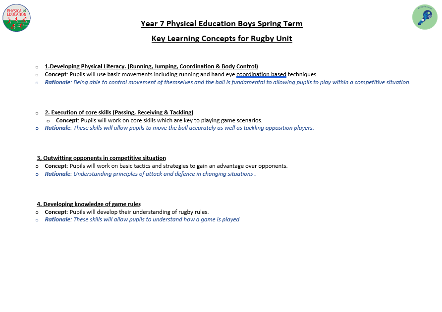 We aim to develop pupil’s skills and knowledge in key processes using relevant activities as a vehicle to enable pupils to develop as a performer as well as a whole person. The programme not only allows students to develop their technical and tactical ability, but it also allows them to develop their inter-personal and social skills. Key terminology and subject specific language are taught to improve students understanding and their ability to articulate ideas and solutions to problems which are encountered. Pupils will also develop their understanding of key areas which relate to their health, well-being as well as relevant anatomical and physiological aspects.