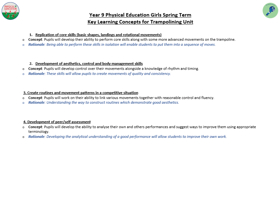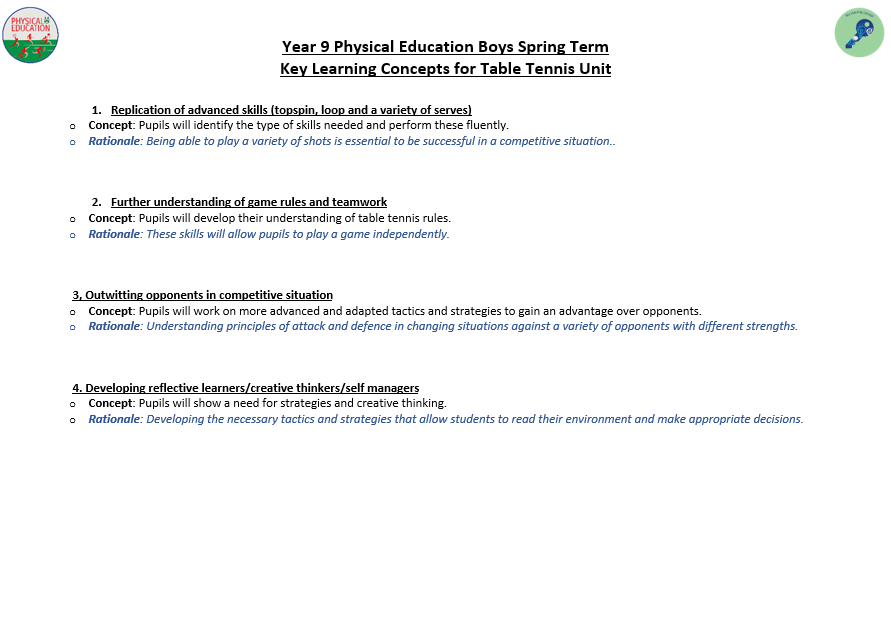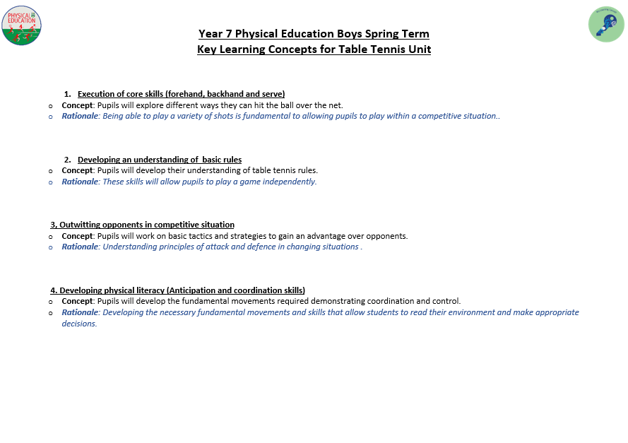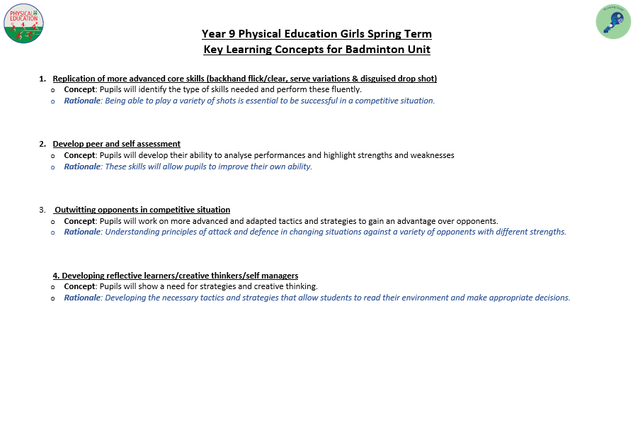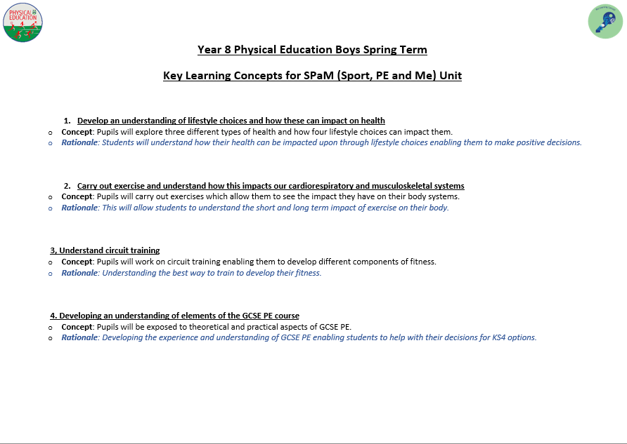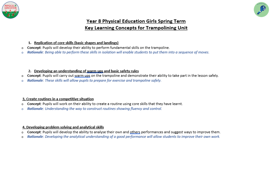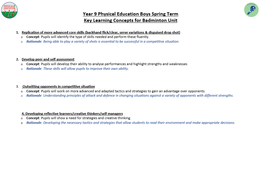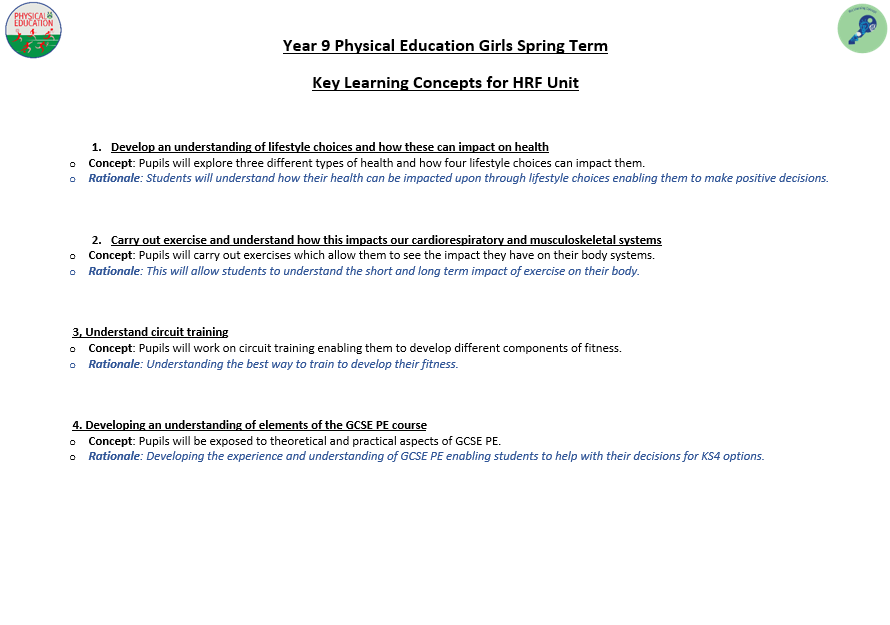 We aim to develop pupil’s skills and knowledge in key processes using relevant activities as a vehicle to enable pupils to develop as a performer as well as a whole person. The programme not only allows students to develop their technical and tactical ability, but it also allows them to develop their inter-personal and social skills. Key terminology and subject specific language are taught to improve students understanding and their ability to articulate ideas and solutions to problems which are encountered. Pupils will also develop their understanding of key areas which relate to their health, well-being as well as relevant anatomical and physiological aspects.