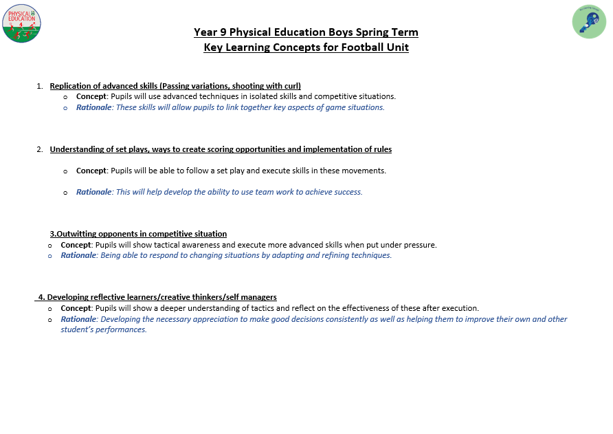 Our intent is that lessons and other opportunities will enable students to understand what makes a performance effective and how to apply these principles in their own and others’ work. Students should also develop the confidence and interest to get involved in exercise, sports and activities out of school and in later life and understand and apply the long-term benefits of physical activity.