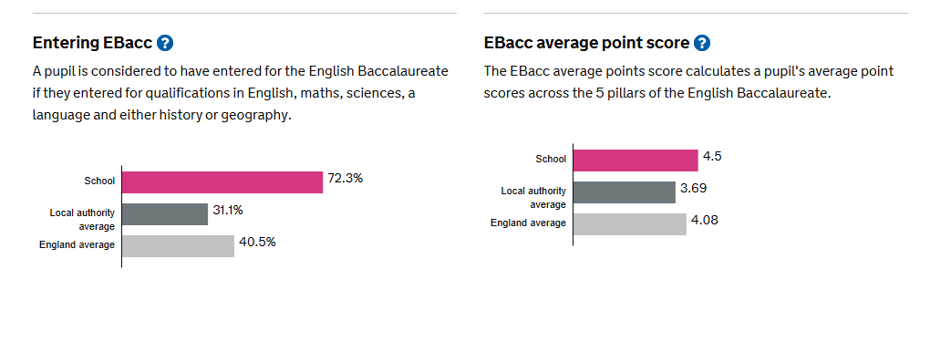 These provisional figures tell you about performance of pupils at this school who completed key stage 4 opens a popup . Most of the measures published here, in October 2025, relate to students who completed key stage 4 in the summer of 2025, with the exception of destination measures, where the cohorts reported are stated below. For more information on how we calculate performance measures please see the KS4 technical guide.