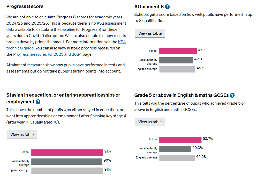 These provisional figures tell you about performance of pupils at this school who completed key stage 4opens a popup . Most of the measures published here, in October 2025, relate to students who completed key stage 4 in the summer of 2025, with the exception of destination measures, where the cohorts reported are stated below. For more information on how we calculate performance measures please see the KS4 technical guide.