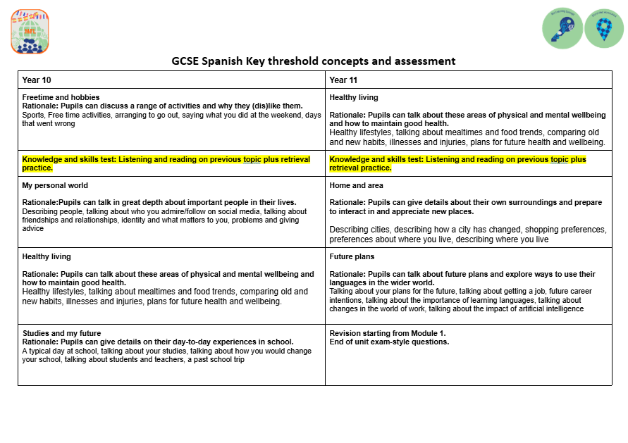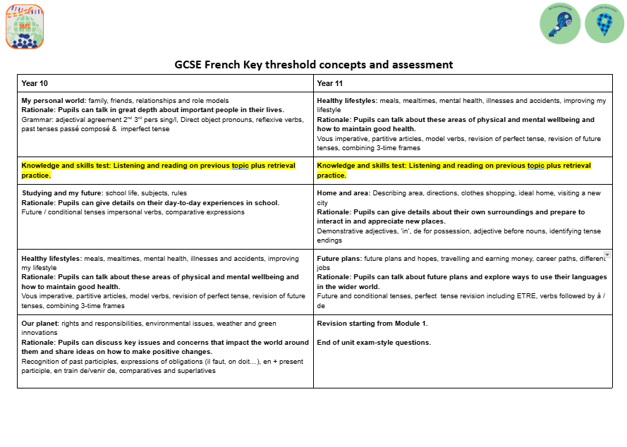 The MFL curriculum aims to equip students with the necessary knowledge and skills to be able to converse in the Target Language countries, to gain cultural knowledge and to be able to cope with the demands of the 4 skills in the GCSE examination. Students are immersed from Year 7 in the language and culture of the language studied. The tailored Schemes of Work ensure that students experience all four skills of Listening, Speaking, Reading and Writing on a regular basis. Pupils develop confidence when using the vocabulary and grammatical structures both inside and outside of the classroom. The curriculum is sequential and builds knowledge and skills over time. This helps to develop students’ resilience and independence in their language learning.