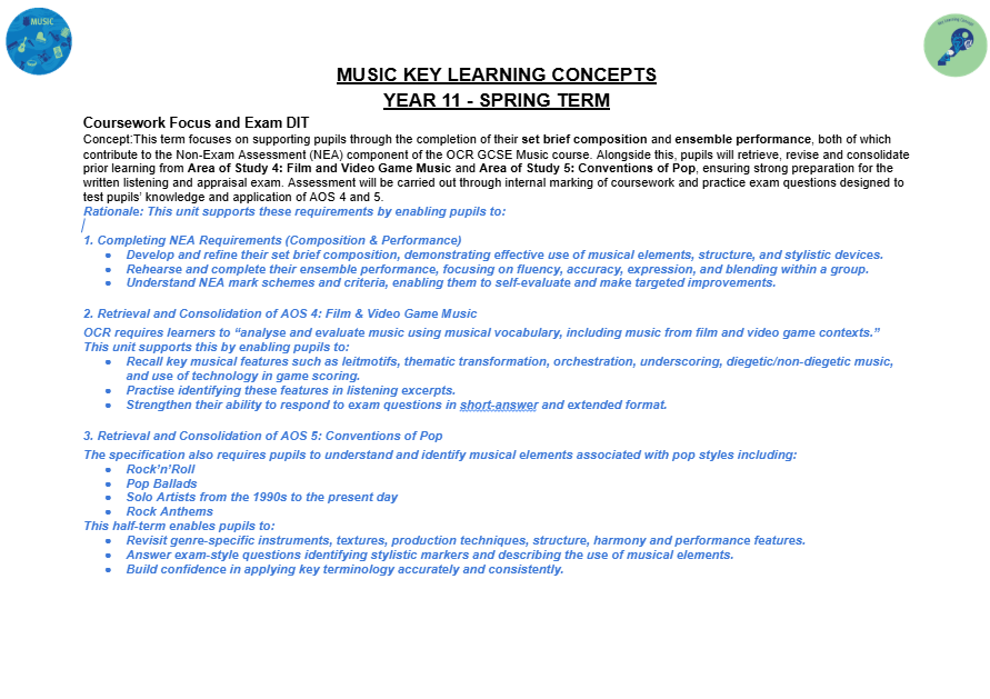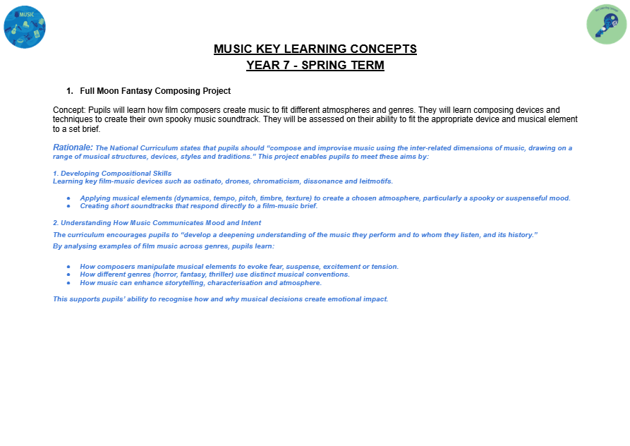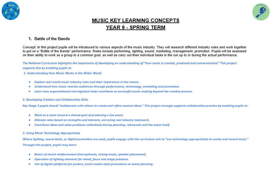 Music can open all sorts of doors and create opportunities for developing skills that can benefit a wide range of subjects and our curriculum design, which is tailored to meet the needs of individual groups, ensures that all students make progress towards successful outcomes in year 11 and are fully prepared to further their music studies post-16.