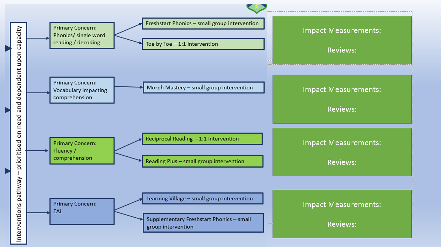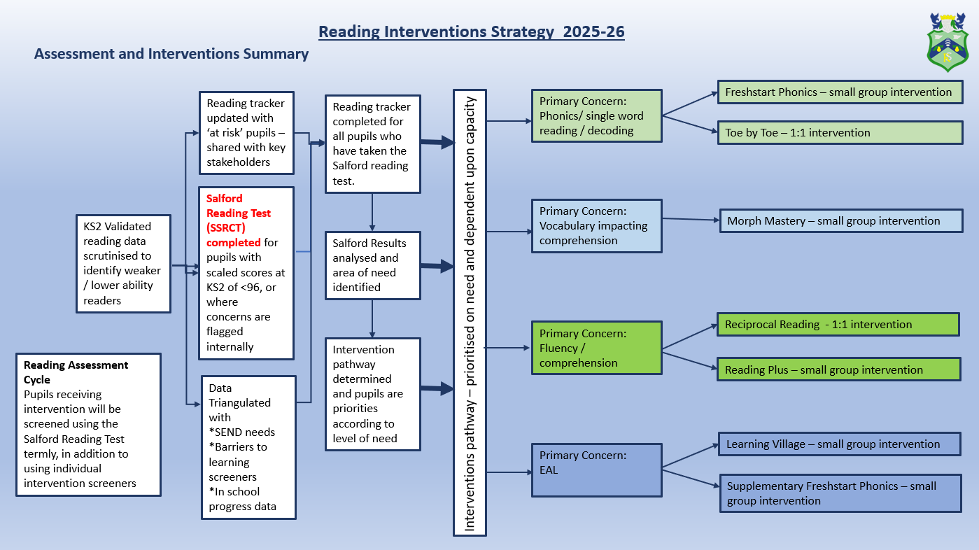 · Initial Identification: We use KS2 reading data and termly assessments (Salford Standardised Comprehension and Reading Test) to identify pupils needing support.