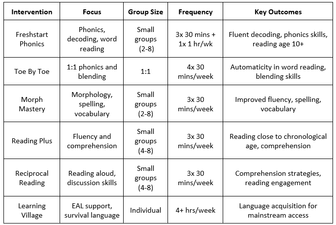 · Tailored Interventions: Pupils receive personalised support through evidence-based programmes such as Freshstart Phonics, Toe By Toe, Morph Mastery, Reading Plus, Reciprocal Reading, and Learning Village (for EAL learners).