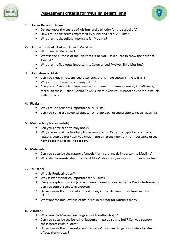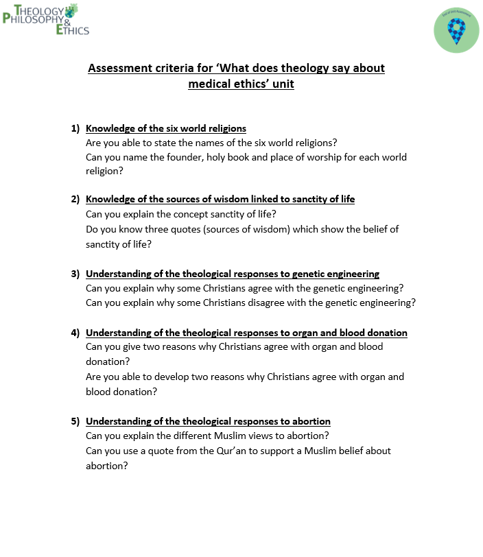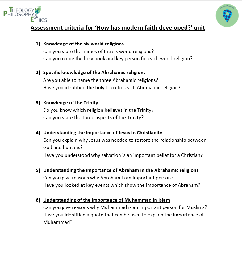 Pupils will answer the key topic questions at the end of each topic to allow reflection in regard to their own worldview. They will be assessed formally using an end of topic assessment to ascertain understanding of knowledge and level of skill.