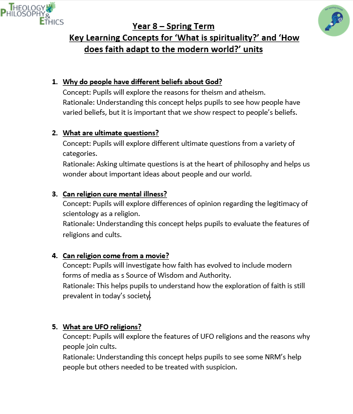 The curriculum is spiral, in that the knowledge and skills learnt in each topic is a pre-requisite for future topics. Our curriculum will ensure that pupils have a breadth of knowledge about the major world religions, philosophical themes, ethical theories and a depth of knowledge about the religions present in the local area.