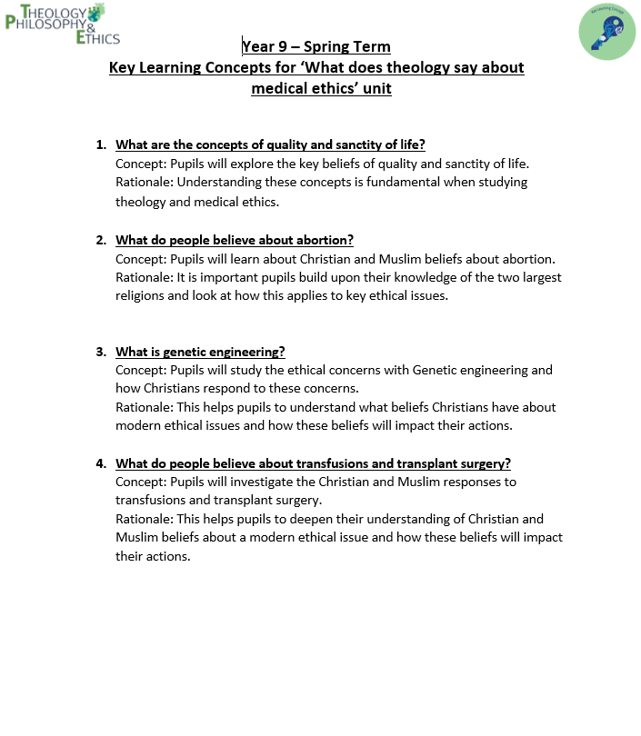 Year 9 Units of Study: What does theology say about science? What happens when we die? How does theology deal with medical science issues?
